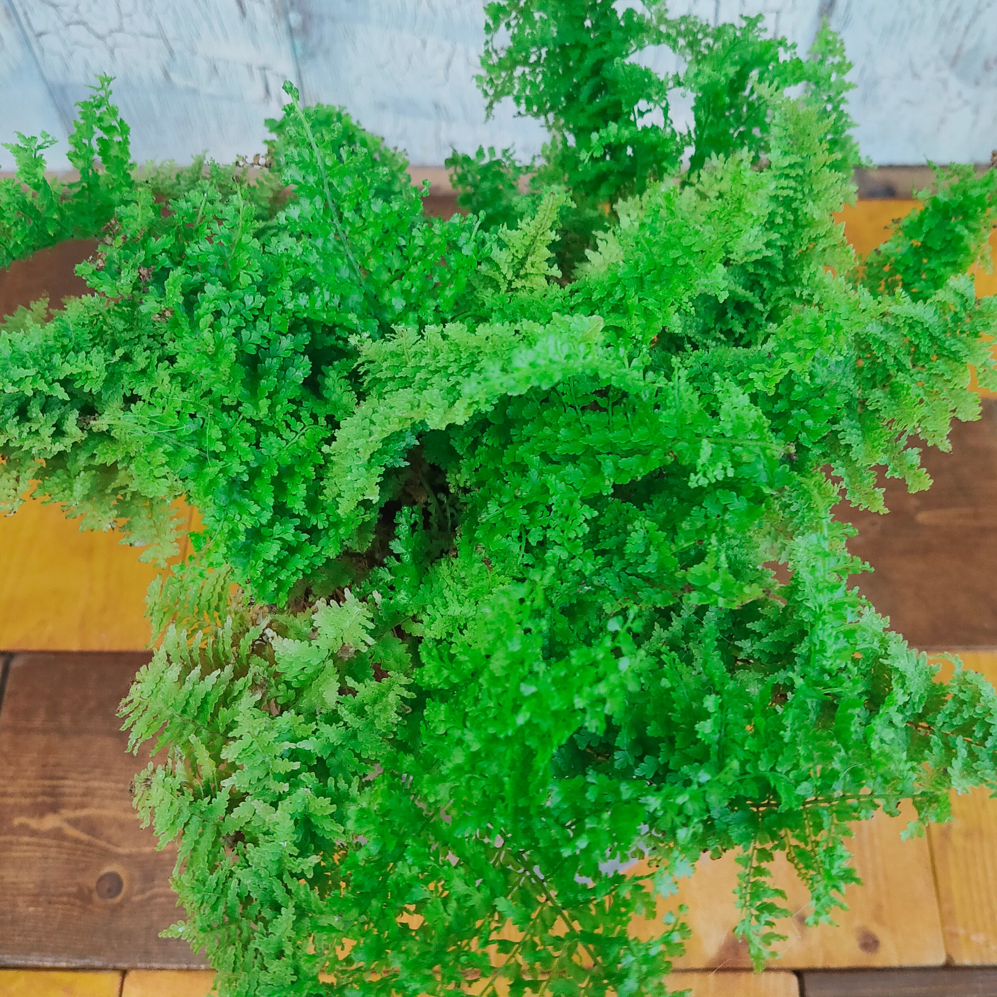 緑色の小さな葉が密集して生え、霧吹き水を与えるとキラキラと光ります。